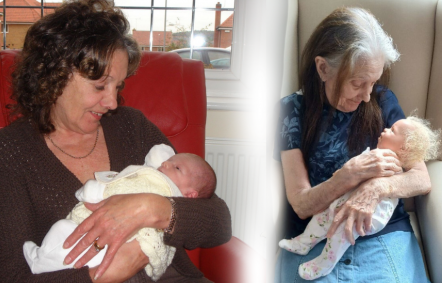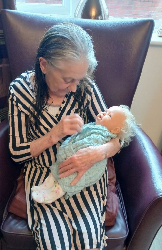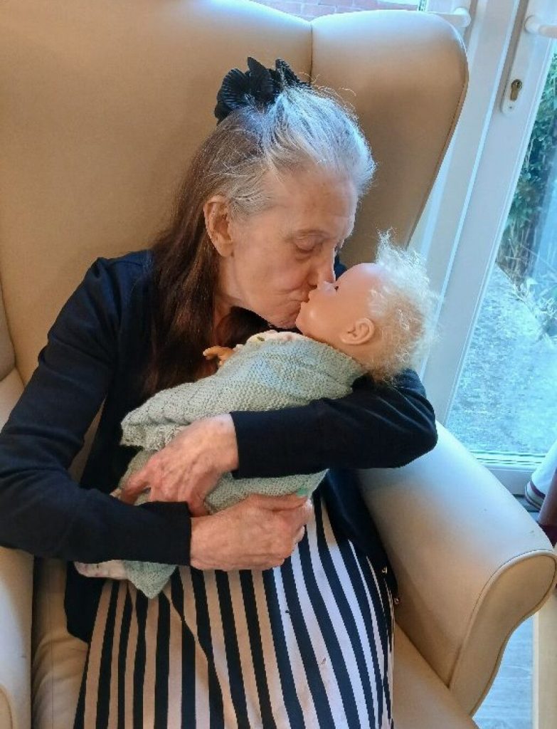 “I must admit, when I first saw Mum with a doll, my reaction was one of shock to see her with something I associated as a child’s toy. This was echoed by her grandchildren who also were quite shocked to see their grandma with a doll. Now, we’ve all come to see the benefit that has to my mum. How the interaction keeps her calm and focused on something other than the dementia. You can see the joy on Mum’s face and I believe it takes her back to better memories”