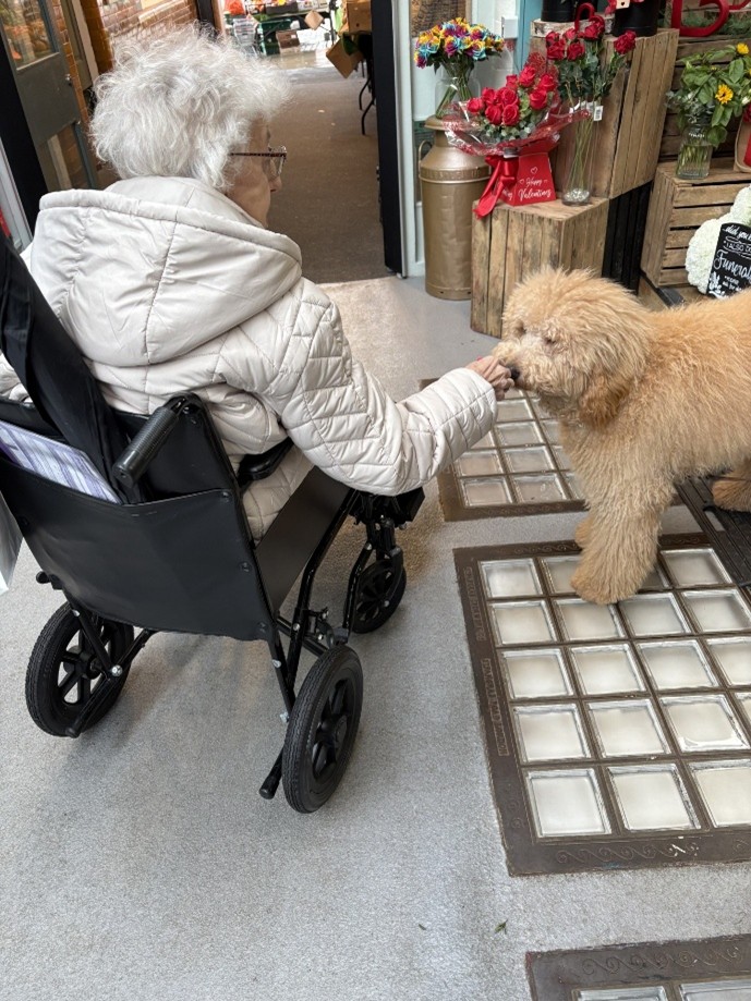 This philosophy was evident during a recent outing into the community with Activities Co-ordinator Gabi. Kathy led the way for the trip, first choosing to visit the Leek Butter Market. She was especially keen to explore the bird feeder and pet stall, taking time to look through the different types of bird feed. The visit sparked fond memories, and Kathy reminisced about her younger days, feeding birds in the garden. On the way out of the Butter Market, Kathy spotted what she said was "the most beautiful fluffy dog" . She paused to say hello and gently stroked the dog, enjoying the moment of connection. Along the way, she also saw a few familiar faces, stopping to have a lovely chat and catch up with old friends and neighbours.