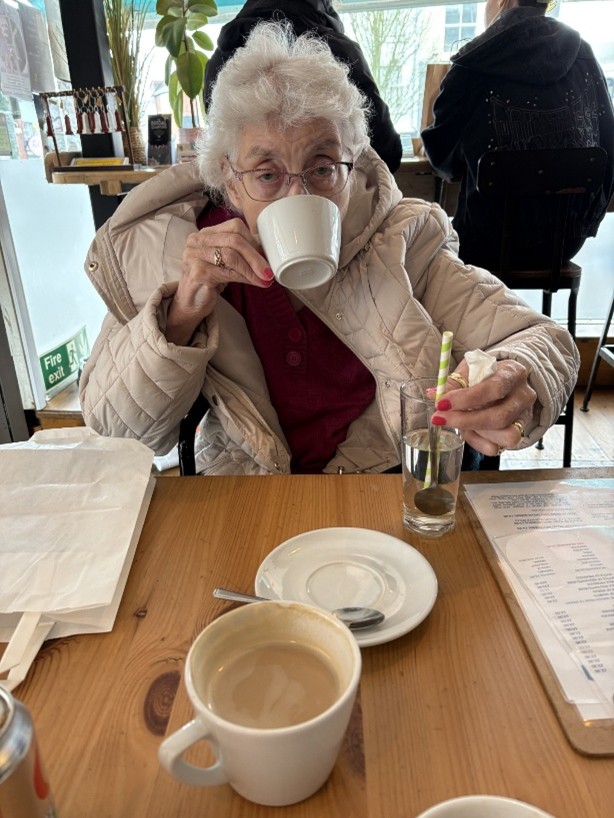 After exploring the market, Kathy was ready for a coffee break and chose to visit a cosy café called Café Apollona. With gentle support, she selected and ordered her own drink, speaking directly to the waitress to promote independence and confidence. Over coffee, Kathy shared more stories, from her childhood through to her youth, delighting in reminiscing with Gabi. With a little encouragement, she was supported to pay for her coffee herself, further fostering her sense of independence.